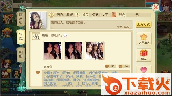 点击好友列表内好友右边的空间按钮可进入好友的空间,可在好友空间进行留言、送礼、点赞的操作。在ta的相册中还可以查看该好友之前发表的所有状态哦。