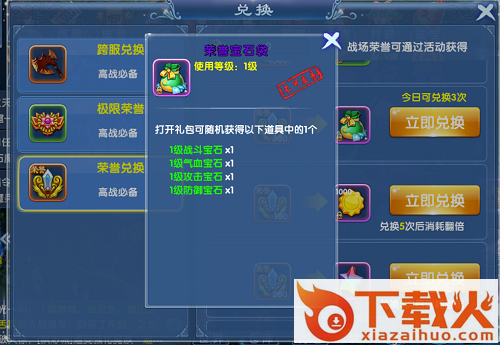 礼包兑换:想要战斗宝石吗?想要强化保护符吗??那就换兑换跨服荣誉礼包吧,让你的装备镶嵌宝石闪闪发亮,战力飙升。