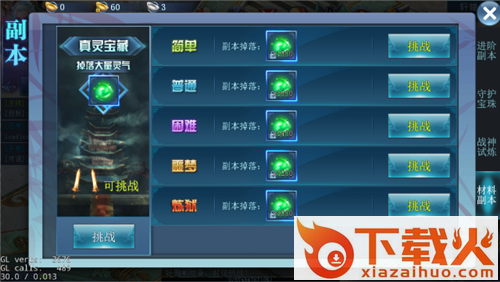 材料副本包括:灵气、进阶丹、银两副本;每个副本依据难度分为不同关卡,挑战关卡需达到一定角色等级;