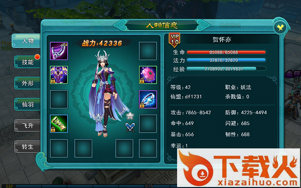 在人物界面里,玩家可以查看角色的装备、技能、外形、仙羽、飞升、转生等信息,还可以从正面欣赏角色的造型。