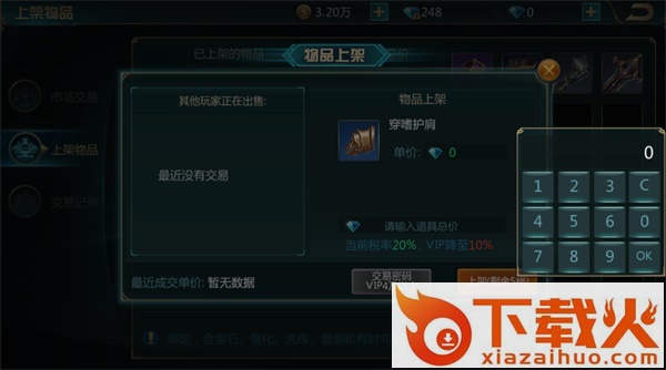 市场中的物品价值不是绝对的,由玩家自己决定,以钻石为单位。卖出物品所得的钻石中抽取20%作为税收上交,交税过后的钻石才是卖家真正所得。VIP玩家可以将税率降至10%,还可以设置交易密码。