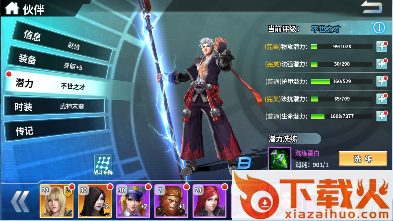 2、当前评级是对伙伴当前潜力能力的综合评价。共分5个层次(由低到高):无闻之才,可造之才,不世之才,巅峰之才,无量之才