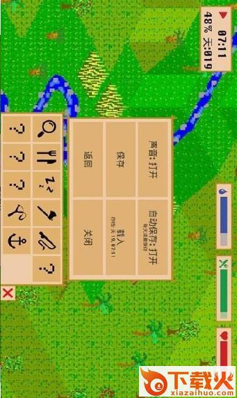 游戏画面复古,结构简单,但基本的荒岛生存玩法都比较有趣:探索、采集、简单的组装道具,建设和求救等等。你需要不断地探索荒岛,收集一定数量和种类的物品然后自己做成工具、搭建帐篷、堆起篝火、制造树屋等等,不过在这期间你会消耗大量的水、食物和生命值,任何一个见底都会狗带。当然你可以寻找野果、种田和建设水渠,完成自我供养。