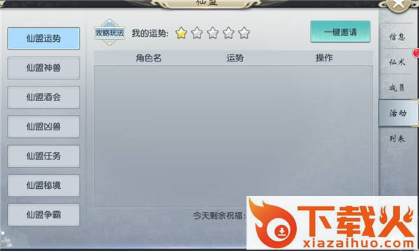 仙盟活动含有7项,各类活动可以提供相应产出或者buff