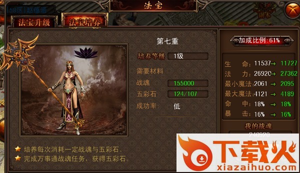 在法宝系统中还能对法宝进行培养。法宝培养需要消耗五彩石和战魂(五彩石可以