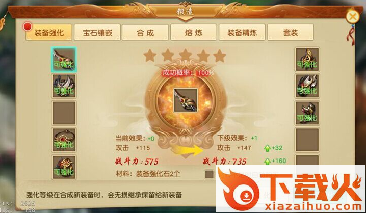强化条件:装备未达到强化顶级,每次强化需消耗一定数量的装备强化石,点击材料文本会弹出对应的物品说明tips