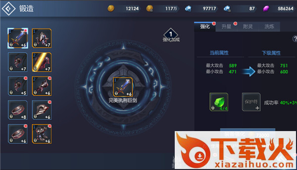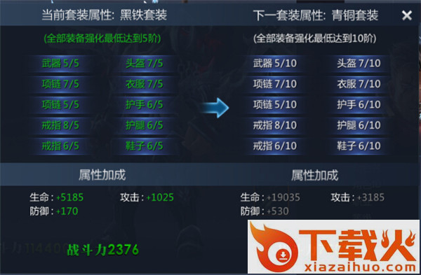 当全身装备强化最低达到对应阶数时,可激活套装属性,获得额外的属性战力加成!