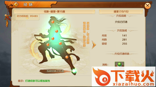 每条经脉有15重,每一重需要冲穴7次才能提升,达到15重则为打通该经脉。