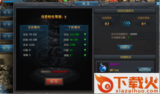 转生分为12个等级,等级越高可获得更多的各项属性加成,极大的提升角色的战斗力。每个转生等级均有相对应的转生装备,不仅拥有比普通装备更为华丽的外形,更有着十分强大的属性。转生等级提升需要消耗转生修为,可以通过活动、礼包、商城等得到的修为丹来获取修为,也可通过消耗经验和金币兑换大量修为。经过转生的角色可以进入更为危险的转生地图,与更强大的头目战斗,获得更为极品的装备与丰厚的稀有材料。更多游戏信息,尽在119手游网。