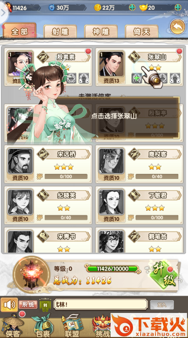 游戏收录了金庸武侠三部曲的知名侠客,且还在不断请入更多的侠客与他们的独家绝学。玩家需要根据各个侠客的特性,将侠客放在不同的位置,组合侠客间不同的搭配,攻略不同副本与难关。成为江湖之中的一代传说。