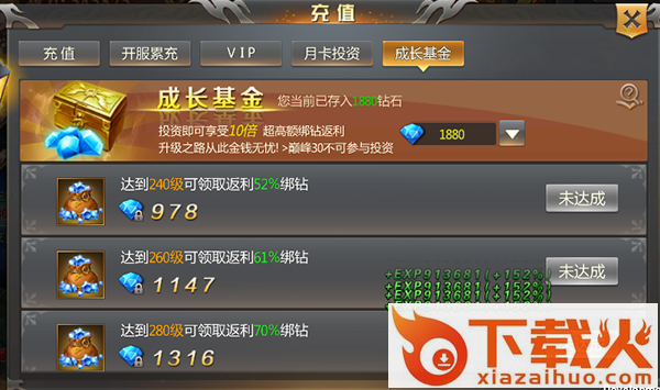 只需要300钻石便能分别在一个月内获得总值2100的绑钻,七倍的收益。平时绑钻我们可以用来买鼓舞、离线挂机卡、复活、进阶丹等等必备的东西。所以月卡投资是绝对不会亏的,必买!