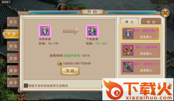 小提示:装备升阶需要消耗对应的升阶石,高级的升阶石可以通过将多余的低级的升级石合成获得,升阶石可以通过神秘宝库和挑战BOSS获得。