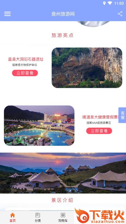 盘州旅游网是专为想去盘州旅游的用户们打造的一款旅游服务软件,这里详细介绍了本地各个景点的情况,为用户提供吃喝住行一系列便捷服务,用户可以在线查看景点周边的酒店民宿,一键快捷预订房间,在这可以购买到景点的门票,有需要的用户快来下载吧。