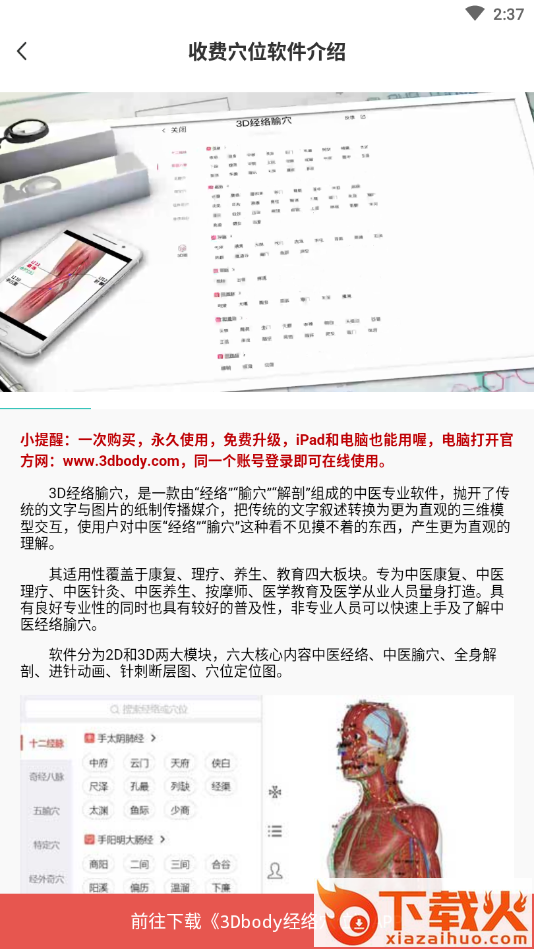 3Dbody经络穴位App,在手机上体验3D图形的带您认识各经络,各穴位的,全身上下都看遍做遍,了解身体穴位更加立体可见,清晰学习到准确的经络穴位的位置不是问题。...