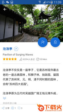 沧浪亭导游是将语音导游、门票信息、旅游攻略、景点美图、旅游足迹等全面集中展现;