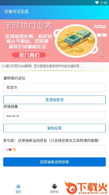 形象对话生成app,将文字转换为抽象表情进行聊天的实用工具,不仅能够将文字生成抽象话,还能还原抽象话到拼音,使用简单,轻松上手,让用户聊天更开心。
