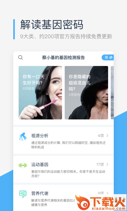 微基因app,解读基因密码,9大类、约200项官方报告持续免费更新;探究祖源,翻阅基因书写的祖源故事;了解风险,相关风险早知道;健康生活,了解自己,才能更好地生活;更多功能,更多专业或有趣的功能,持续添加中...
