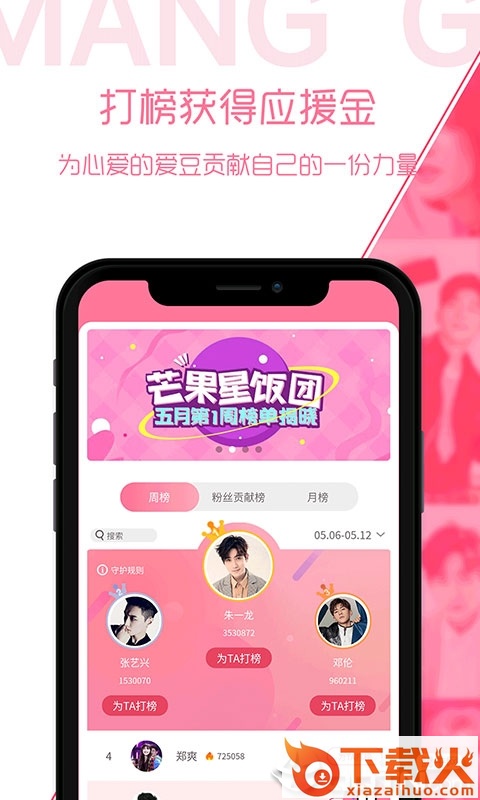芒果星饭团app,大家一起来这里为你的爱豆打榜增加人气值吧。来芒果星饭团app,不仅能将喜欢爱豆的聚集在一起,而且还能看到爱豆的最新信息哦!...