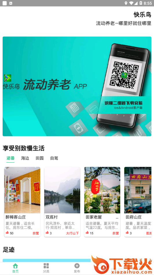 快乐鸟流动养老平台,走进美丽乡村,不同的季节,自由选择合适驻点,实时查看驻点,异地常驻,短驻,与兴趣爱好相同的朋友,一边旅游一边养老,时间自主性强,旅游元素相对丰富,满足中老年人精神需要,不失为最实用的养老APP。