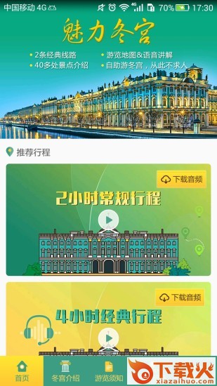 魅力冬宫app是专为冬宫制作的智慧游导览软件,软件拥有景点详细介绍,精品线路推荐,一键登录分享等等诸多功能,觉得不错的朋友欢迎前来下载使用。...