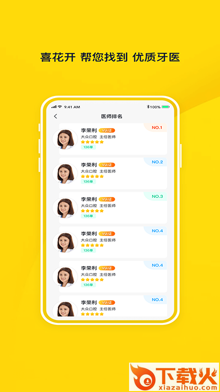 喜花开APP是一款让所有用户能免费洗牙和便捷看牙软件,整合并对接口腔医患资源,帮助用户快速找到身边优质的口腔医疗机构和牙医。通过平台补贴享受和体验看牙优惠政策及真实消费数据透明公开展示,打破口腔医患医疗信息不对称现象,促进实现透明、平等、信任的口腔医患服务模式,同时秉承平等理念,肩负普惠全民的社会责任,致力于让人人享有平等的口腔就医机会。