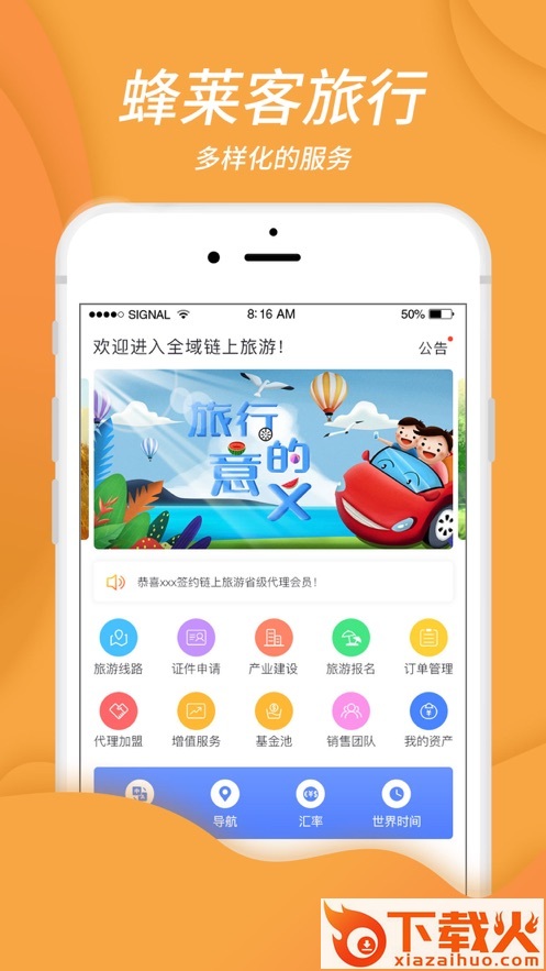 目前该软件的主要功能有旅游线路定制、签证申请、旅游参团、旅游产品加盟、订单管理、翻译、导航、汇率、世界时间、旅游分享等。