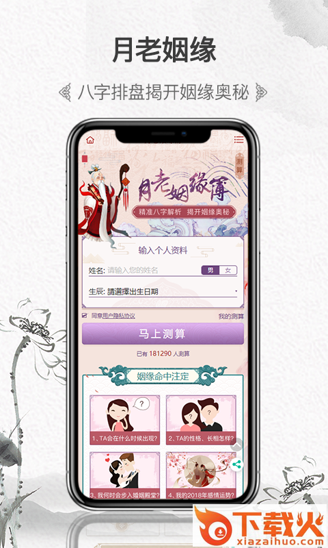 测您与另一半是否命理相合,解决婚前担忧问题,婚后和睦相处建议,为你的爱情保驾护航;