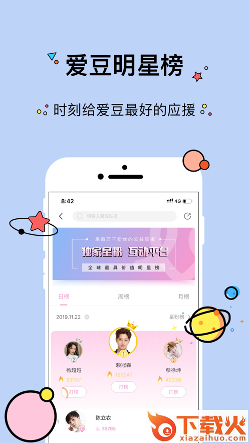 快乐大饼营app是由快乐粉丝会全新升级而来,软件拥有爱豆公益,爱豆打榜,爱豆周边等等功能内容,可以帮助更好的星粉丝公益助力。