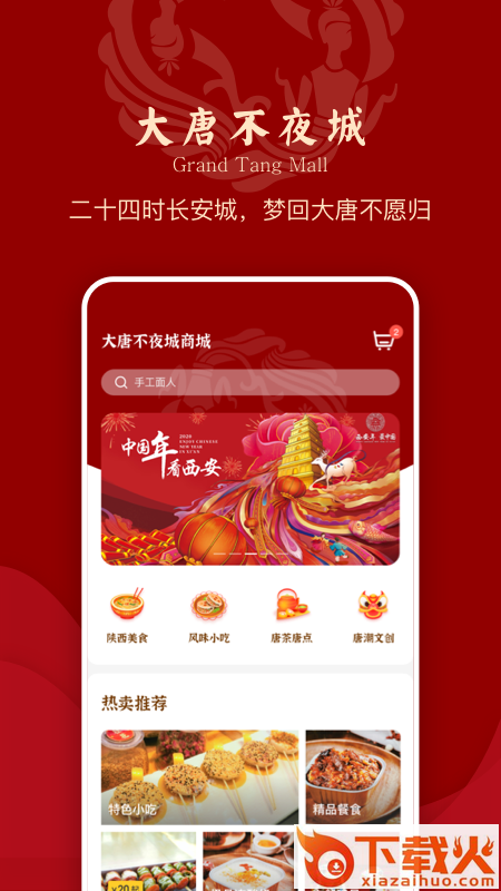 大唐不夜城文化商业步行街app,首页,一应俱全,大唐导览、主题活动、热门直播应有尽有;商城,风味小吃、文创物品、只有你想不到,没有买不到;会员,升级成长,上升你的科考成绩。