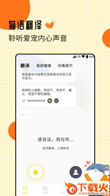 爱宠猫语翻译器app是一款专为铲屎官打造的和爱宠交流互动软件,可以帮助你了解猫猫的叫声,也能将你的声音转换成喵喵喵,感兴趣的小伙伴赶紧前来和猫咪沟通吧!...