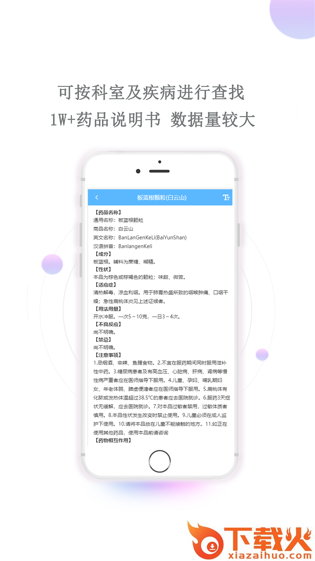 可按科室和疾病查找所需药品的说明书,也可直接搜索某科室的药品。>10000 种药品说明书药品说明书来自药品生产厂家,数据量大,内容权威。