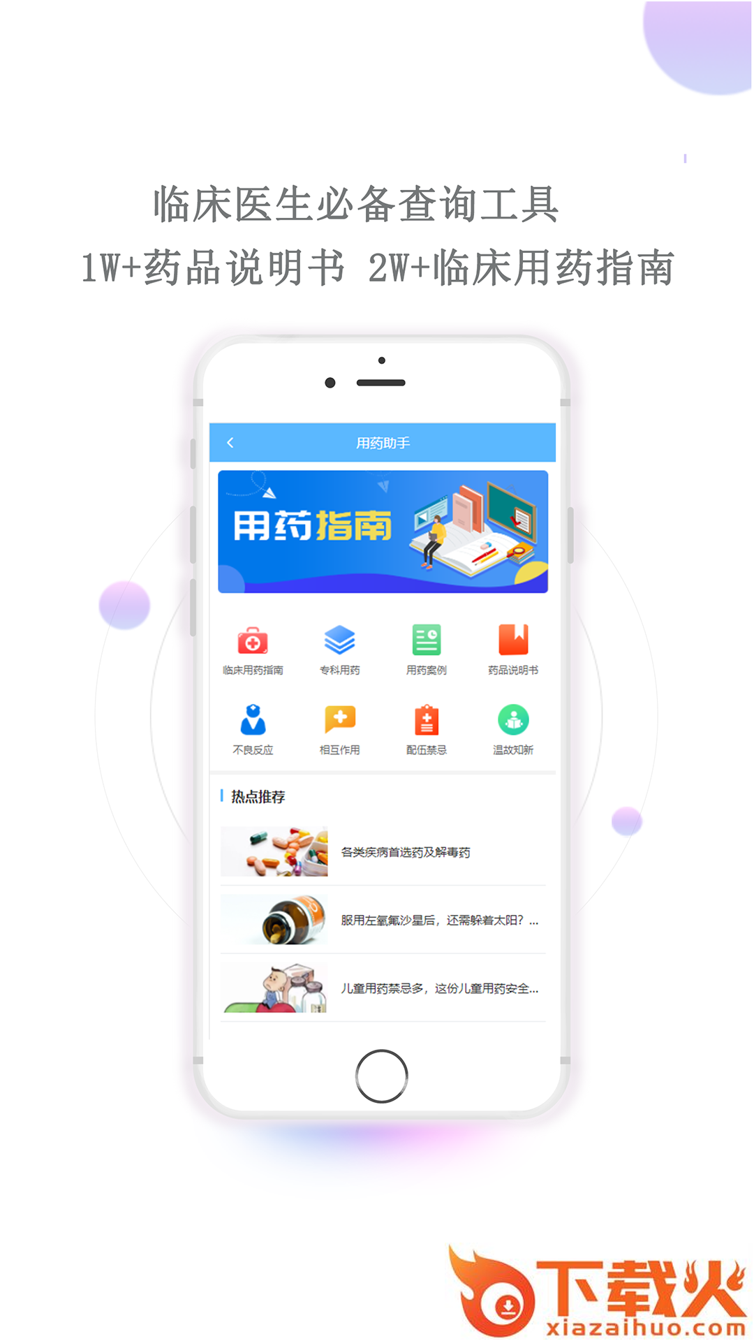 用药助手临床医生必备的用药查询工具,包含临床用药指南、专科用药、用药案例、药品说明书、药物不良反应、药物相互作用及配伍禁忌等几大功能,医生可用来查询药品说明书,查看用药案例,查看药品不良反应及相互作用、查询医保类药品的工具。