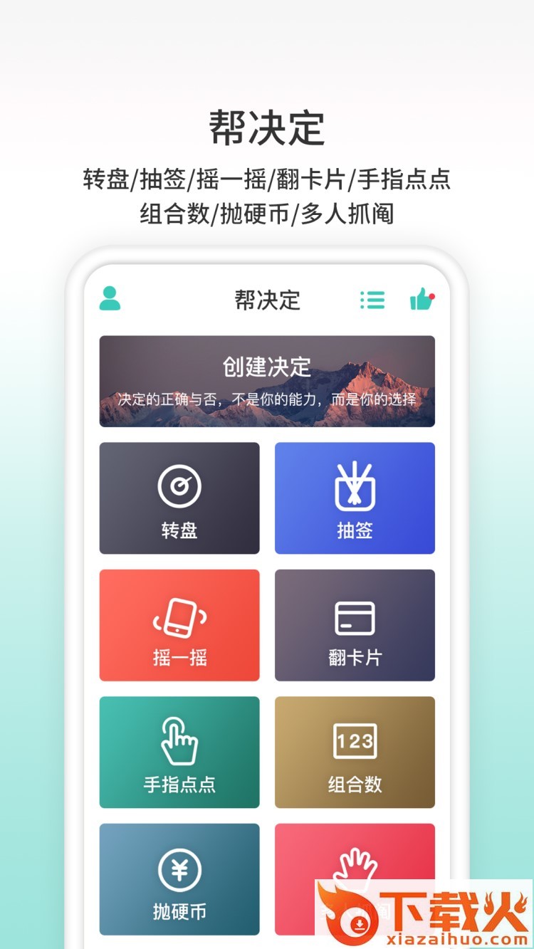 帮决定app下载,一款针对选择困难症打造的决定小助手,通过帮决定app小伙伴们可以快速决定选择,还有更多有趣的小游戏,感兴趣就来下载了解。...