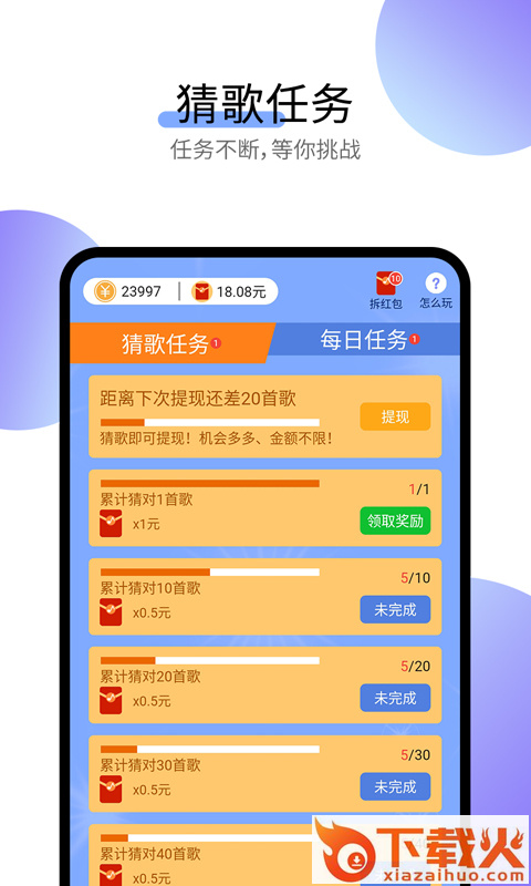 简简猜歌app,一款猜歌赚钱的APP,参与任务即可领取现金红包,手机赚钱更简单。来简简猜歌app,丰富歌曲尽在其中,听歌猜歌名,轻松拿红包,边玩边赚钱。