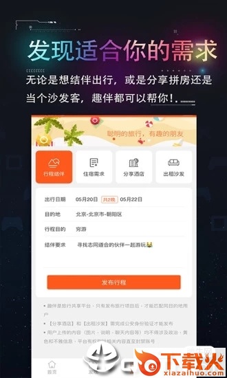 -行程结伴:一个人想去玩但是又害怕孤单,看看附近想结伴的搭伙伴,发现身边的朋友。一起结伴出行,消除孤独感!