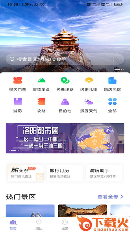 享游河洛app是专为洛阳制作的一款旅游服务平台,平台拥有首页,周边,出游,城市服务等等内容版块,可以帮助用户更好的畅玩洛阳。