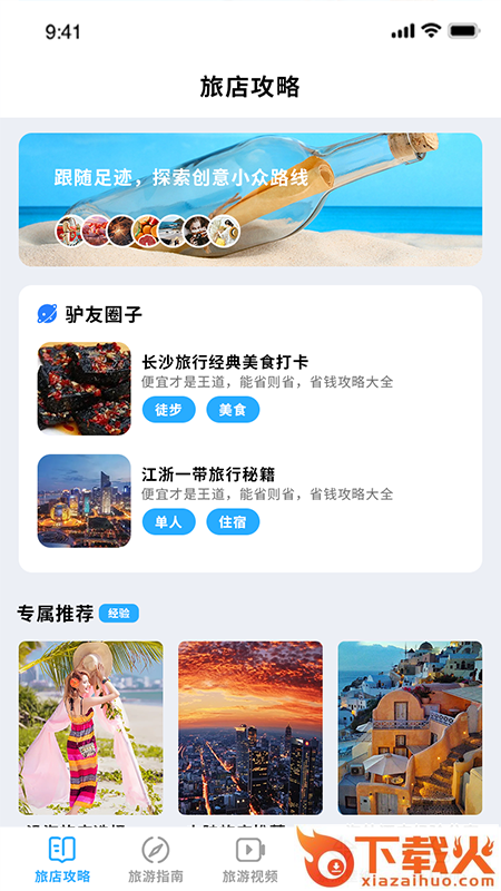 旅行串串app,是你书写自己的故事起点,帮助你打造属于自己的“五星之旅”,这里主要提供了旅店攻略、旅游指南、旅游视频以及景点壁纸等功能。