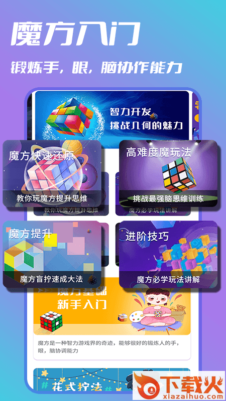 智慧魔方app是一款十分有趣的魔方教学软件。软件为用户提供了多种魔方玩法教学和训练方法,让孩子可以随时在线学习魔方玩法,快速入门,轻松进阶,还能锻炼孩子的观察、思维能力,实用又有趣。