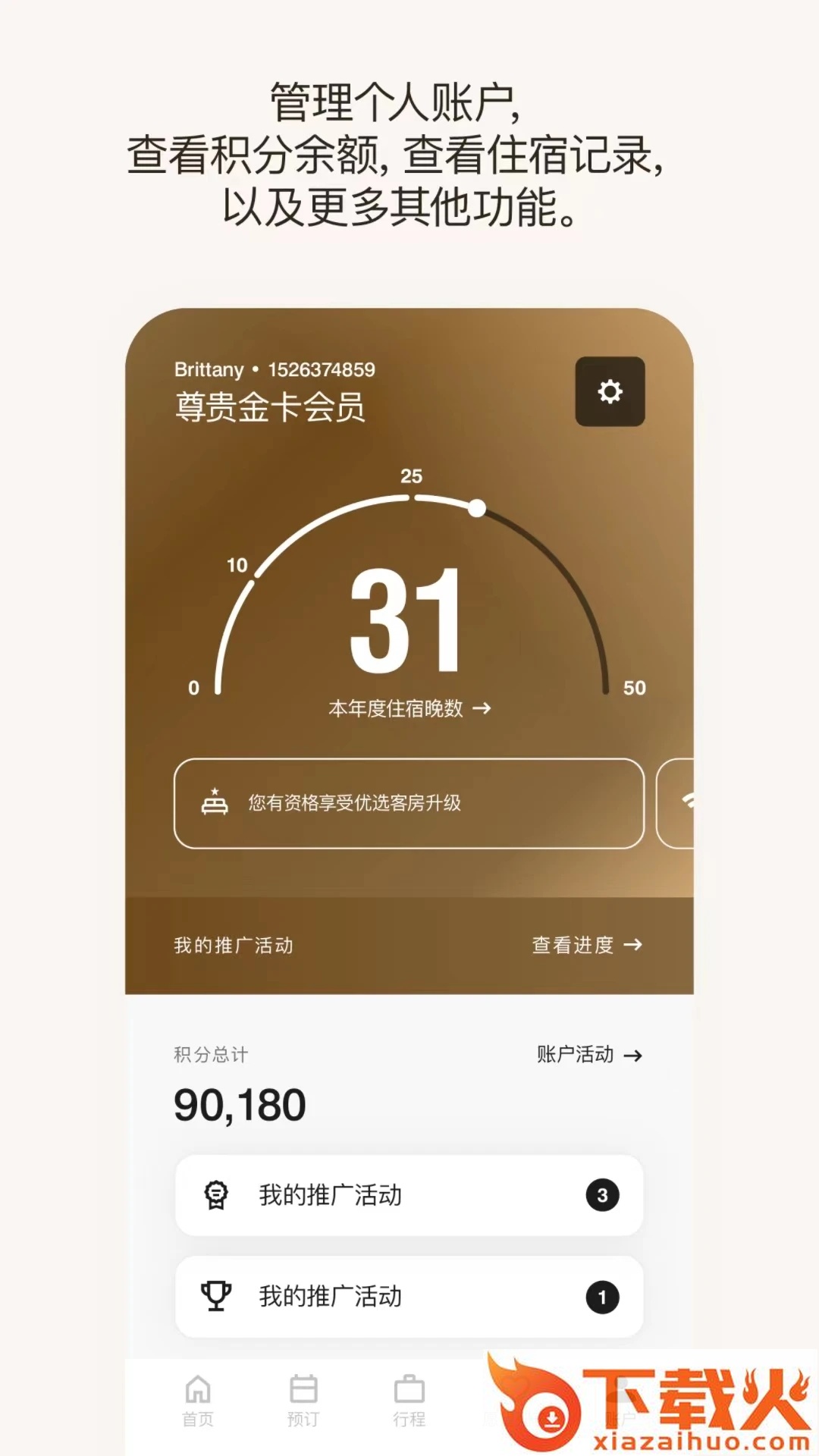 - 账户活动:随时随地查看账户余额、晚数、积分和活动历史