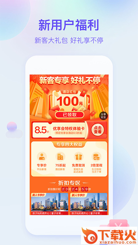--新用户福利:可获新客大礼包,单单有礼,首单可立减,新客专属酒店更实惠;