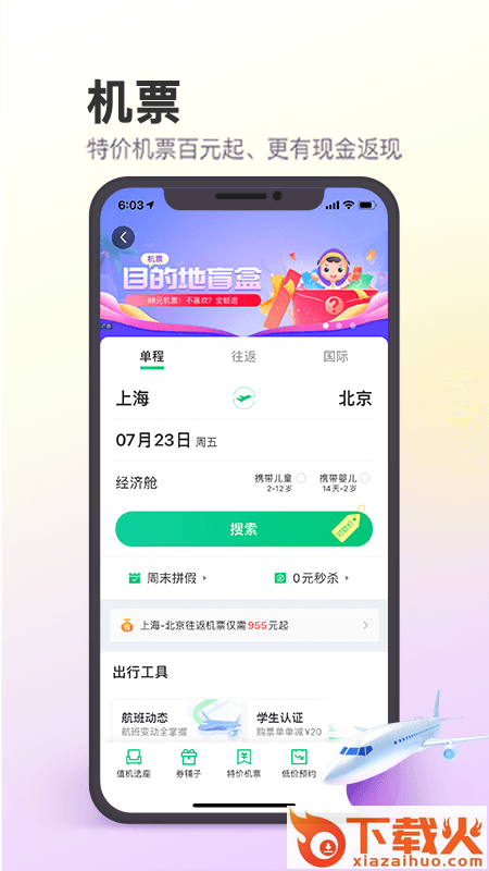 3,机票:全球机票便宜飞、放心飞!特价机票天天有,最低1折起;快捷预订往返机票,在线值机,手机专享优惠,支持在线退款申请;