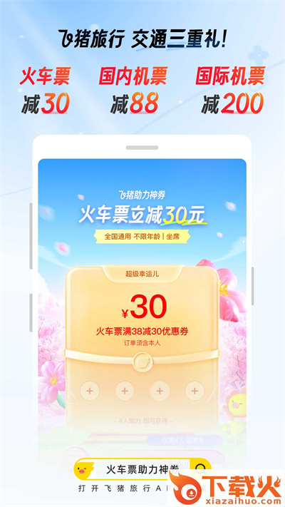51小长假,旅行提前订,好友助力机票减100,酒店减50,火车票减30,飞猪助你五一嗨翻天