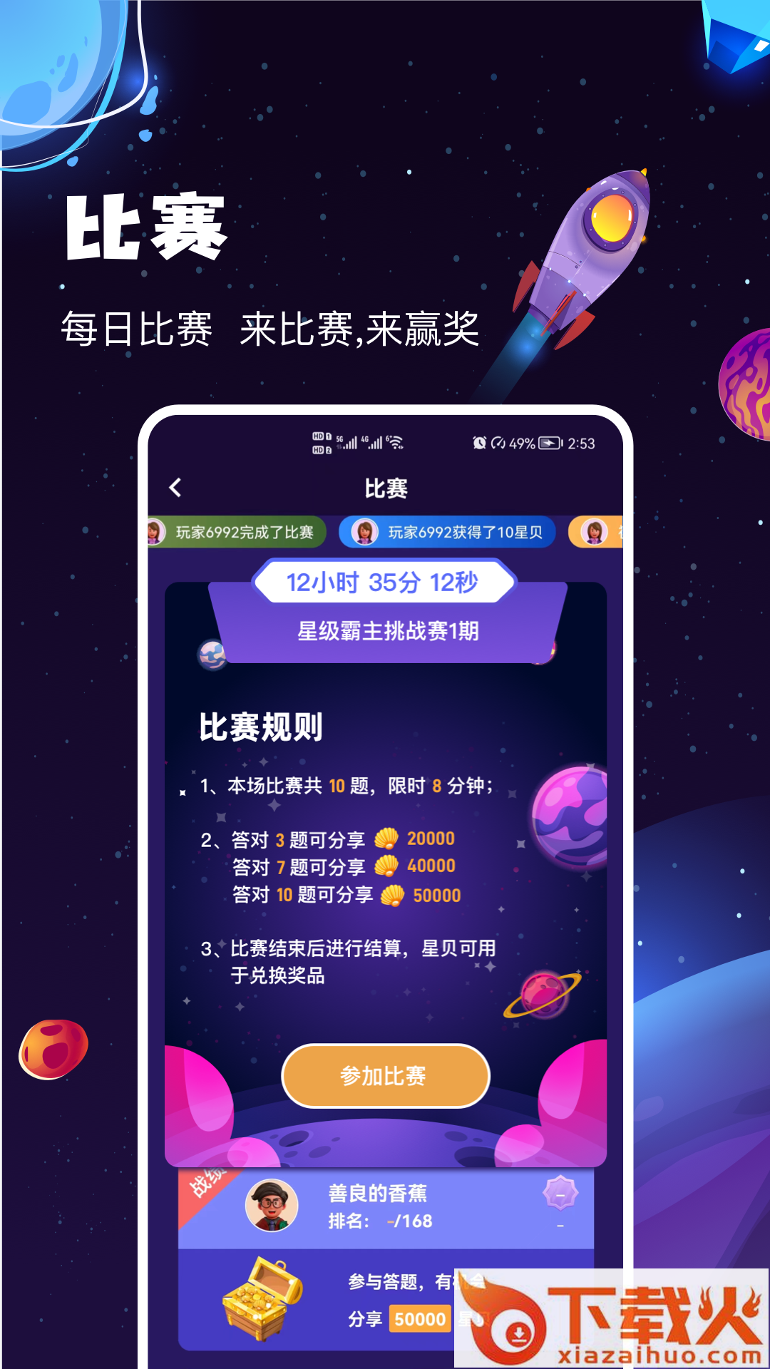 你也可以赢得丰富的奖励,按成绩瓜分比赛星贝,成绩越好星贝越多,获得星贝,兑换奖品,获得积分,升级段位,积累成就,等等多重奖励,尽管来拿。
