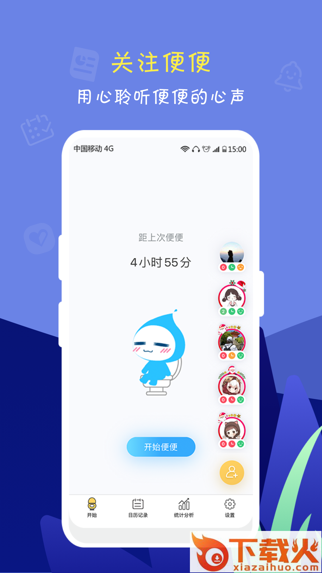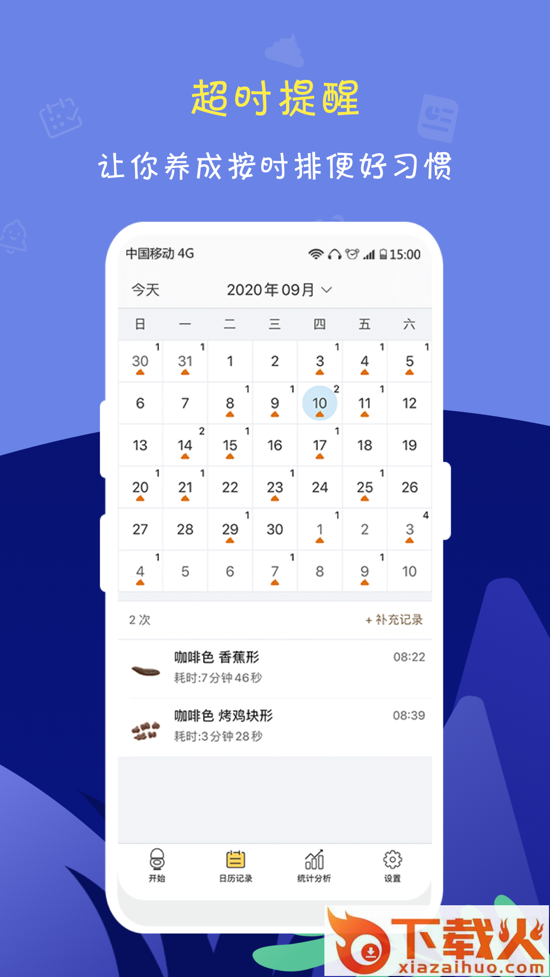 -便便记录:和跑步一样,点开始即可,还有可爱的便便小人和你一起蹲,一点都不孤单!偶尔忘记?还可以补充记录。