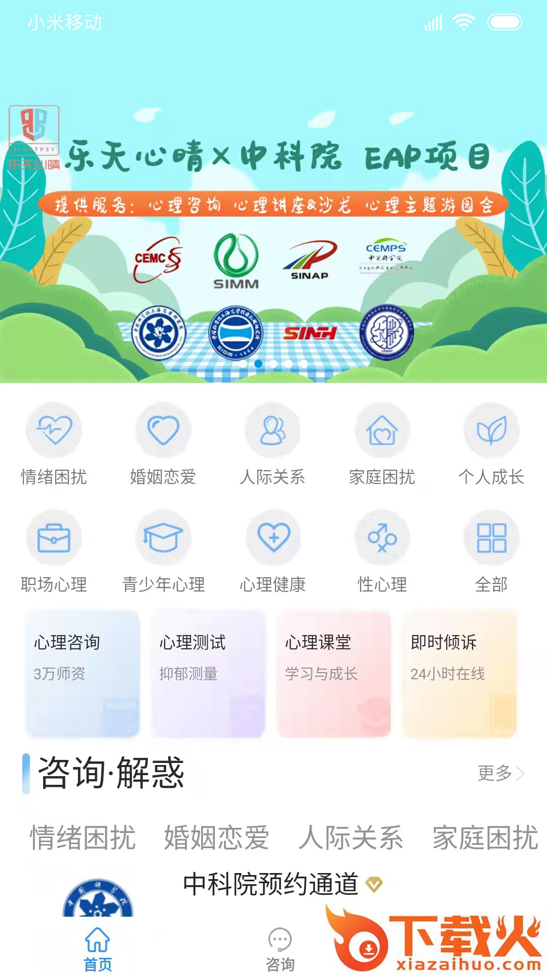 乐天心晴app是一款专业的心理咨询平台。软件拥有2000位经验丰富的心理咨询师,为用户提供线上语音,视频心理咨询、线上语音视频倾诉、提供线上心理测试、心理知识,问答,线上课程,企业EAP服务,成长记录等模块。