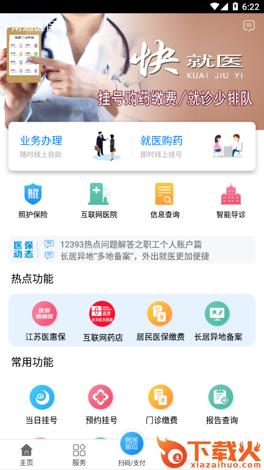 其面向南通市医保参保人员提供定点单位预约挂号、诊间缴费、就医购药个人现金和医保基金“一键式”支付和住院押金线上缴纳服务;提供医保定点单位信息、医保药品(诊疗项目)目录、政策法规、政策口径、热点问答等公共资讯和个人医保权益查询;
