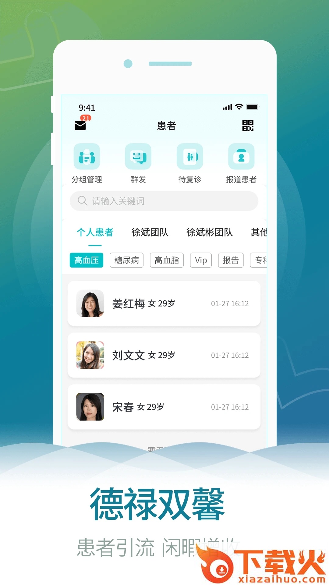 【患者管理】直接高效行医, 智能管理患者。可以为复诊、咨询和线上报到的患者进行标记、分组,进行病情跟踪等