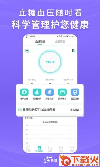3、健康管理:让用户每天可观看血糖、血压指数,实时了解身体状态,科学管理健康。