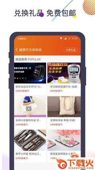 每天可以领取健康币,3天就可以兑换礼品,所有礼品均免费+包邮。新增加手环、美甲七件套装、抱枕、购物袋、保健杯等兑换的奖品。