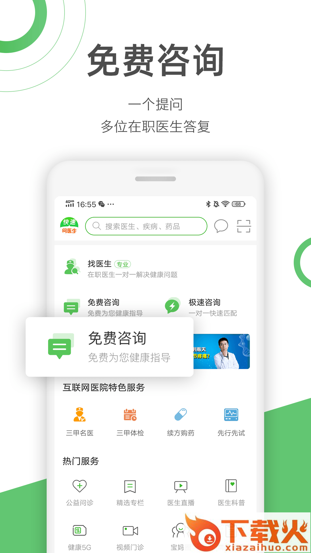 你与掌控健康的距离,只隔着一个APP:快速问医生,将医生装在手机里,海量医生随你选,健康问题随时问、随便问。 妈妈时常上火,口干舌燥,是怎么回事?该怎么办? 睡眠不足,压力大,身体亚健康,该如何调养?为何大便变得不规律,时常肚胀?感冒怎么办?头疼怎么办? 哪家医院好?哪位医生好? ……